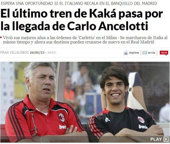如今在《马卡报》看来,只要安切洛蒂能够执教皇马,他便肯定可以找到重新激活卡卡的办法,因为师徒之间对彼此十分熟悉,一旦卡卡能在皇马重新找回巅峰状态,他便有望搭上参加2014年世界杯的末班车。不过《马卡报》同时也有指出,不排除今夏皇马出售卡卡的可能性,俱乐部对其加盟以来的总体表现感到失望,一名替补球员竟然拿着900万欧元的年薪,这是皇马无法接受的事情。
