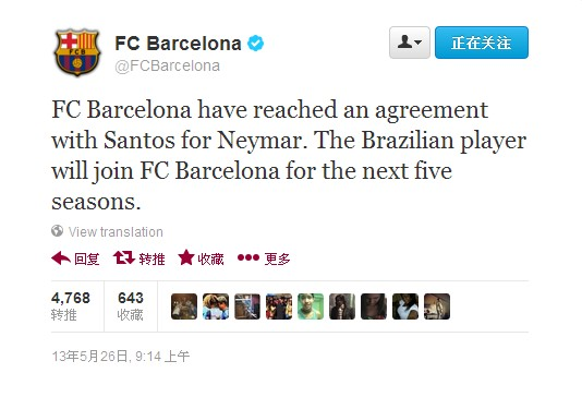 巴萨俱乐部随即在官网上宣布内马尔即将加盟,“巴萨俱乐部已经和桑托斯俱乐部、内马尔达成协议,内马尔在未来5个赛季将成为巴萨球员。”由于内马尔还要代表桑托斯出战巴西联赛,所以他和巴萨的正式签约将在下周一(27日)进行。巴萨官网撰文盛赞内马尔为“21世纪的球王”,是贝利钦点的接班人。在过去4年,内马尔为桑托斯出场256场,攻入156球。