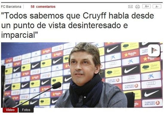 克鲁伊夫此前曾有表示,他对巴萨对待阿比达尔、巴尔德斯等人的做法感到费解,比拉诺瓦认为克鲁伊夫是在有一说一。“有些事情我得澄清一下,克鲁伊夫先生向来很关照我,以及关切俱乐部的相关运作,每个人都知道,他在谈论某件涉及利益关系的事情时总是能够站在客观、公正的角度。”