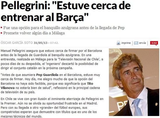 12/13赛季西甲第38轮巴萨VS马拉加,赛前双方主帅发表讲话,巴萨主帅比拉诺瓦的讲话没有什么亮点,然而马拉加主帅佩莱格里尼的讲话抖出猛料。智利工程师透露,2008年夏天瓜迪奥拉成为巴萨主帅前,佩莱格里尼险些执教巴萨。