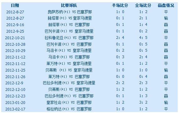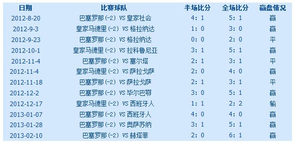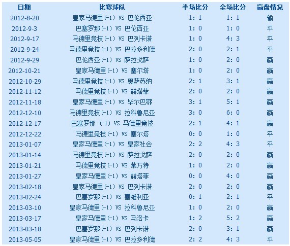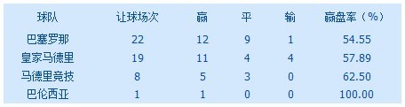 球队方面,巴萨共有22场让球,总成绩为12胜9平1负,赢盘率为55%。皇马有19场让球,11胜4平4负,赢盘率58%。此外,马竞让球的场次有8场,为5胜3平,赢盘率62.5%。巴伦西亚有1场让球,1胜。赢盘率100%。