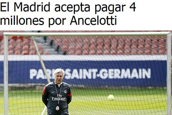穆里尼奥离开皇马已经将近一周了,如今皇马终于基本敲定了新任主帅人选。据《马卡报》透露,皇马和巴黎圣日耳曼经过艰难的谈判谈妥了安切洛蒂的违约金。皇马将为安切洛蒂支付400万欧元的赎身费,圣日耳曼愿意在这一价位放走意大利人。