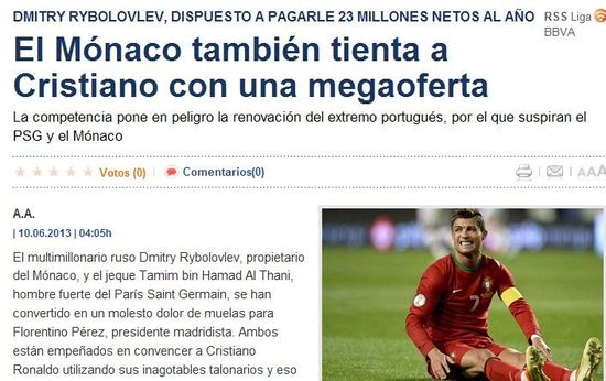 摩纳哥是今夏转会市场上最为疯狂的烧钱大户,该队已经斥巨资收购了法尔考、穆蒂尼奥、詹姆斯-罗德里格斯和卡瓦略,如今又把引援对象聚焦到了C罗身上。据悉雷博诺夫列已经告诉C罗经纪人门德斯,他愿意为葡萄牙人开出世界最高的2300万欧元年薪,同时还会给葡萄牙队长以全额肖像权。这也就意味着,C罗可以拥有自己全部的广告收入。