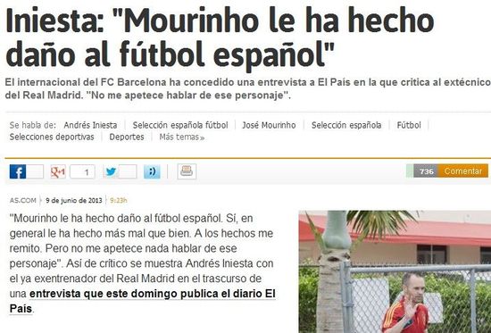 在穆里尼奥宣布离开皇马时,巴萨副主席比拉卢比就曾公开宣称,穆里尼奥严重伤害了西班牙足球。在接受《阿斯报》采访时,伊涅斯塔也谈到了这一点。小白明确指出,穆里尼奥带来了更多的负能量,他认为狂人伤害了西班牙足球的形象。