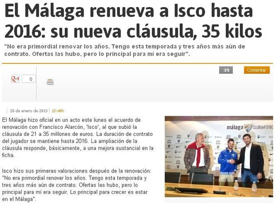 《阿斯报》:马拉加宣布同伊斯科续约至2016年
