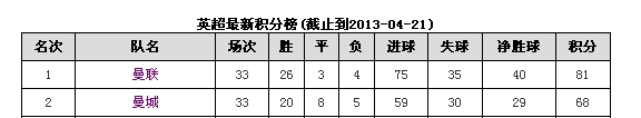 附:英超积分榜前2名(截止到2013年4月21日23点)