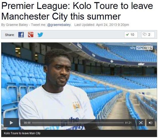 今年已经是科洛-图雷效力曼城的第4年,图雷明确指出,他没有收到俱乐部要和他续约的通知,意味着他将会在今夏离开曼城:“我已经在这里差不多4年了,头两年我踢了很多比赛,非常美妙,我听到球迷在唱我和亚亚的歌,我会怀念这些东西的。对我来说,我的家人就在这里,我的孩子在这里的学校,他们爱这里,但在两个月里,俱乐部没有任何(有关续约的)消息,我正在考虑我的未来。”