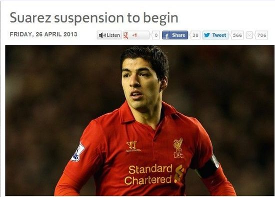 北京时间4月26日晚,英足总在官方网站上宣布,利物浦前锋苏亚雷斯接受英足总对其10场禁赛的处罚,禁赛立刻生效。这也就意味着,苏亚雷斯将缺席本赛季利物浦最后4轮联赛,以及下赛季利物浦的前6场国内比赛(英超、足总杯和联赛杯)。
