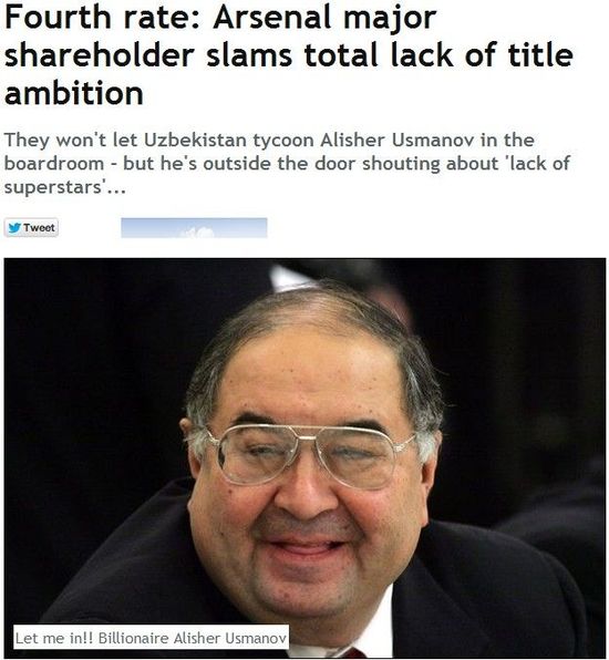 乌斯曼诺夫不止一次表态,只要他能够进入阿森纳董事会,他愿意拨给温格无上限的转会资金,但阿森纳董事会不为所动,这也让不少阿森纳球迷都非常不满甚至愤怒。本赛季开始后,乌斯曼诺夫也不止一次抨击阿森纳卖掉范佩西和宋的做法,并且批评阿森纳高层管理无方。