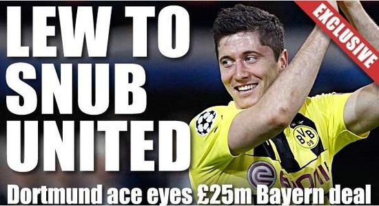 日前,曼联主帅弗格森明确表示,在经过了3、4个月的考察评估后,曼联已经锁定了今夏的转会目标。不少英媒都猜测,在欧冠半决赛首回合独中4球击溃皇马的多特锋霸莱万多夫斯基将会在弗格森的收购名单中,但周二的《太阳报》头条却明确指出,莱万多夫斯基将会拒绝曼联的邀请而转投拜仁。