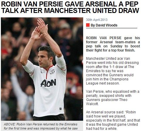 范佩西已经成为阿森纳公敌?至少在阿森纳俱乐部内部来说,这个说法根本不成立。《星报》披露,在上周日曼联做客1-1战平阿森纳后,范佩西还进入到他熟悉无比的阿森纳更衣室,鼓励昔日队友努力杀进英超四强。