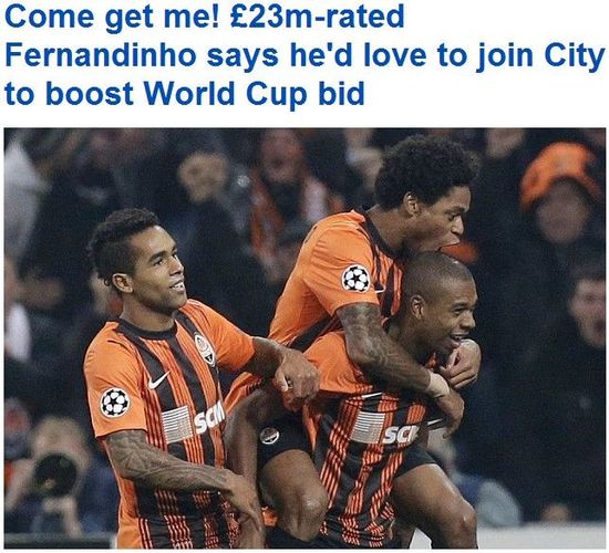 费尔南迪尼奥表示,他的国家队队友都希望他能够去英超踢球:“他们都想我转会,他们知道英超是一个很好的联赛,曼城是一个很好的俱乐部。因此他们都希望我去那里踢球。我相信如果我加盟曼城,我参加巴西世界杯的机会将会大大增加。我的曝光率会大增,因为巴西不看重乌克兰联赛,我在这里的表现得不到认同。”