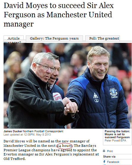 曼联CEO大卫-吉尔表示弗格森的接班人要是一个在国内和欧洲赛场有丰富经验的人,他们要任命的是一个长期接班人,不是一个短期替代者,弗爵在这方面有重大话语权。英国权威媒体《天空体育》称曼联将在48小时内任命新主帅,《泰晤士报》则称莫耶斯24小时内将上任。《邮报》也确认曼联最迟将在当地时间周四晚宣布莫耶斯是弗格森的继任者。