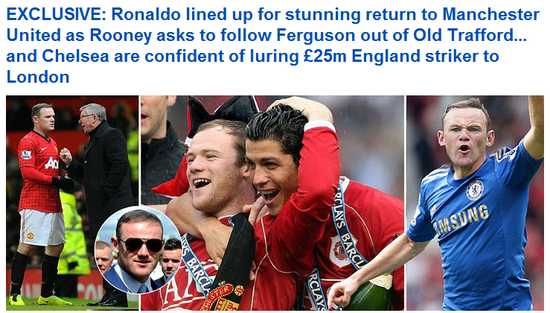 弗格森宣布退休后,曼联正发生着翻天覆地的变化,《每日邮报》称两周前鲁尼要求转会遭拒,而切尔西将为他报价2500万英镑。另外曼联CEO吉尔正和C罗的经纪人谈判,希望回购在皇马打进200球的CR7。