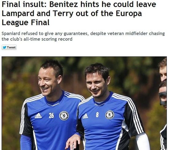 欧洲当地时间下周三(15日)晚间,本赛季的欧联杯决赛将在切尔西与本菲卡之间展开。英国媒体今日指出,这场关键的冠亚军争夺战,切尔西的两位队长特里和兰帕德恐怕只能在替补席待命。英媒认为这是贝尼特斯对两大功勋的“终极侮辱”。