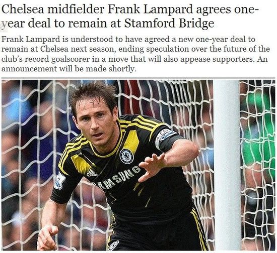 切尔西欧联决赛在即,让切尔西球迷最忧心的莫过于兰帕德的续约了。今日的《电讯报》披露,兰帕德已经同意与切尔西续签一年合同。除此以外,因为特里将会缺阵欧联决赛,34岁的兰帕德还将会戴上队长袖标出战。