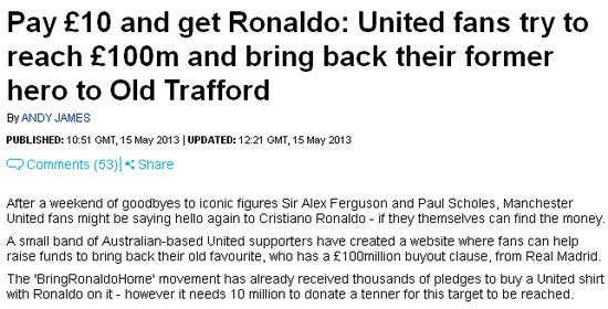 C罗的违约金高达1亿英镑,囊中羞涩的曼联掏不起,然而球迷的力量是无穷的,他们知道CR7在皇马并不开心,于是发起“带C罗回家”运动,筹集转会费。这项活动的发起者是一小群澳大利亚球迷,三天前他们在FACEBOOK和推特上上传了活动视频,很快被疯传。