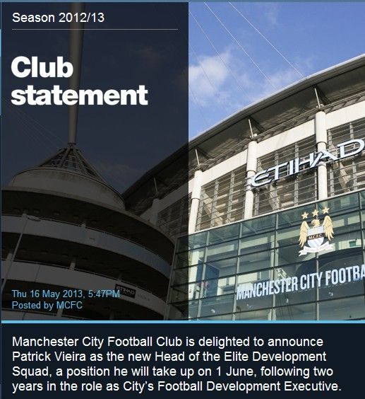 在宣布炒掉曼奇尼后,曼城继续调整俱乐部教练组。当地时间5月16日下午,曼城官方宣布,现任曼城足球发展总监的维埃拉将会在6月1日后出任曼城青年队总教练。