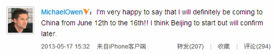 北京时间5月17日,曾效力于利物浦、皇马和曼联等球队的英格兰著名球星欧文亲承,今夏他将来到中国。欧文在微博上说:“我很高兴地宣布我将在今夏6月12日到6月16日来到中国,北京可能会是第一站,(具体行程)随后我会进一步确认。”