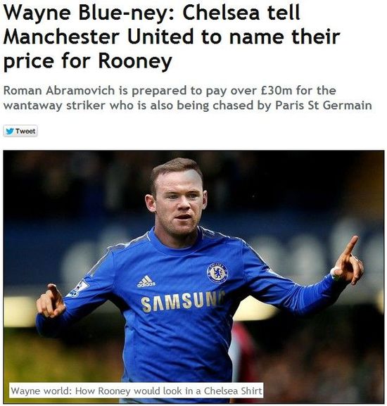 《镜报》:切尔西要求曼联就鲁尼转会报价