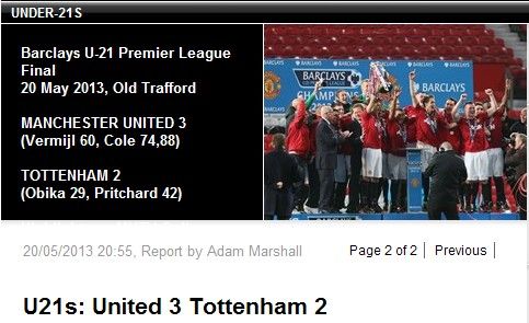 曼联一线队夺得了2012/13赛季英超冠军为退休的弗格森送行,而曼联青年队也不甘人后。在昨晚的首届U21英超决赛中,曼联U21在上半场落后2球的情况下,下半场又爆发了魔性连追三球,最终逆转击败在两个小组赛阶段排名第一的热刺夺得冠军。