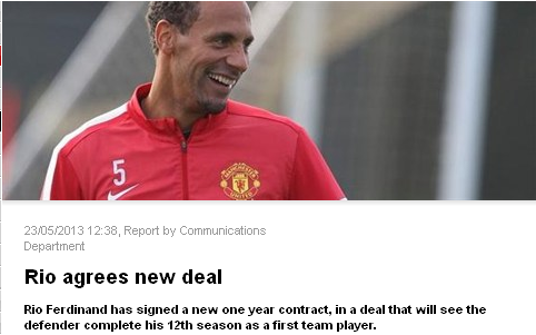北京时间5月23日晚,曼联俱乐部在其官方网站上宣布,34岁的老将里奥-费迪南德已经与球队签下续约1年的合同。这也就意味着,如果履行完合同,2002年夏天加盟曼联的费迪南德,将在红魔效力12年之久。里奥的续约,也击碎了过去几周媒体曝出的“费迪南德今夏退役”不实消息。