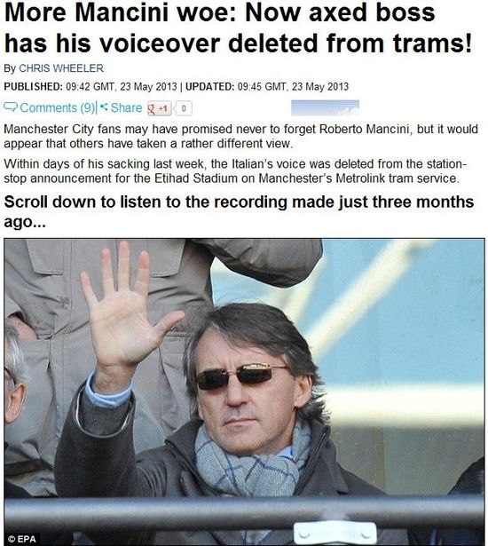 有曼城球迷承诺,他们永远也不会忘记曼奇尼,但也有人开始从记忆中删去这名前曼城主帅。在意大利人被炒掉几天后,曼彻斯特地铁已经在地铁到站广播中删去了曼奇尼的声音。