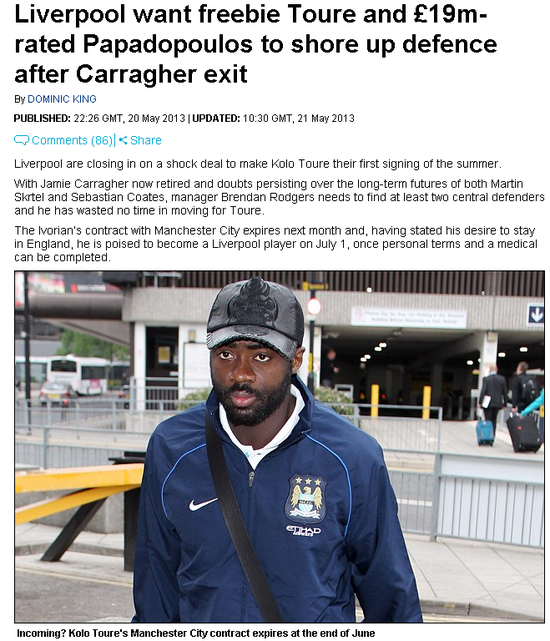32岁的大图雷与曼城的合同今夏就将到期,而他们将不会续约。利物浦已经与图雷商谈合同,如果体检一切顺利,7月1日图雷就将正式加盟利物浦。