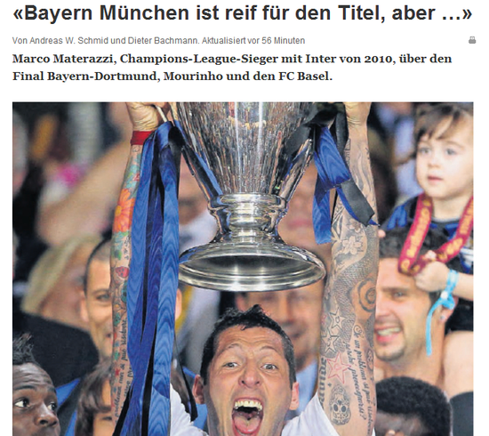 马尔科-马特拉齐日前接受了瑞士媒体《Basler Zeitung》的专访。在拜仁和多特蒙德的欧冠决赛打响前夕,这位前国际米兰后卫回忆起当年和德国球队的那一场决赛,他对于蓝黑军团战胜拜仁捧杯丝毫不感到意外,不过这次决赛他看好拜仁。马特拉齐再一次表达了对穆里尼奥的钦佩,前意大利后卫透露,他可能在未来赴切尔西辅佐葡萄牙人。