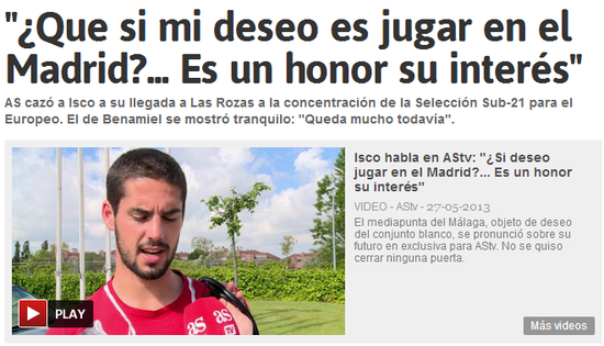 在接受《阿斯报》采访时,伊斯科说:“皇马对我感兴趣是一种荣誉,这说明我在过去一个赛季的表现不错,离开马拉加是个艰难的决定,但我的未来是否会在伯纳乌?这个现在不好说,能加盟皇马自然是很好的结果,但我还很年轻,我要保持冷静,去一家真正适合自己的俱乐部,我不会对皇马关上转会的大门,但现在我需要的是去一支能够踢上比赛的球队,这方面我更信任佩莱格里尼”。