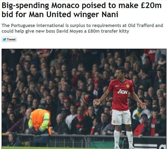 上赛季,曼联边锋纳尼逐渐淡出球队的主力阵容。如今莫耶斯接替弗格森成为球队新主帅,他的地位似乎没能得到改善。英国媒体指出,莫耶斯有意清洗这位表现不稳定的葡萄牙国脚,法甲升班马摩纳哥据说打算出2000万英镑收购纳尼。