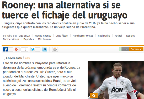 在中锋位置上,路易斯-苏亚雷斯和卡瓦尼是皇马引援的前两号人选。皇马已经与“龅牙苏”谈妥了四年合同,不过还没能和利物浦谈妥转会费。卡瓦尼则距离皇马越来越远了,那不勒斯咬定6300万违约金不放松,弗洛伦蒂诺肯定不会为他砸出如此巨款。据《阿斯报》透露,一旦皇马买不到路易斯-苏亚雷斯,弗洛伦蒂诺就将全力以赴争取收购鲁尼!