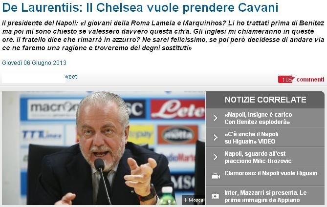 那不勒斯俱乐部主席德劳伦蒂斯也公开证实,切尔西的确在联系卡瓦尼,“切尔西对卡瓦尼很有兴趣,他们将在接下来的几个小时内给我打电话。如果卡瓦尼选择留下的话,我会很高兴,但如果他要离开,那么我也会为球队找到合适的替代者。”