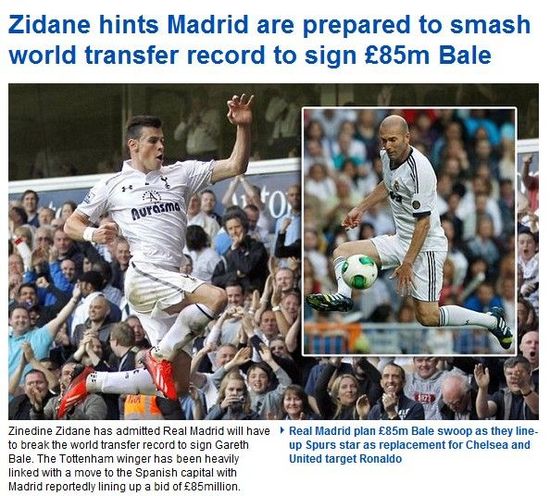 《每日邮报》认为,齐达内此言无疑是释放了一个暗号,那就是皇马正计划用巨资买下贝尔。该报分析称,白衣军团对贝尔的报价很可能达到8500万英镑。2009年夏天,皇马以8000万英镑引进C罗,创造了转会费世界纪录。现在看来,这个纪录有可能被皇马再次刷新。