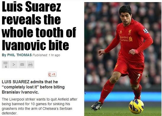 2012-2013赛季英超第34轮,利物浦主场2-2战平切尔西,苏亚雷斯在比赛中咬了伊万诺维奇的右手臂。事后,英足总对苏神禁赛10场。事情过去差不多两个月,乌拉圭人第一次解释了自己的行为,他承认自己犯下大错,他之所以一时糊涂,是因为他一直在为手球送给对方一粒点球生着闷气。