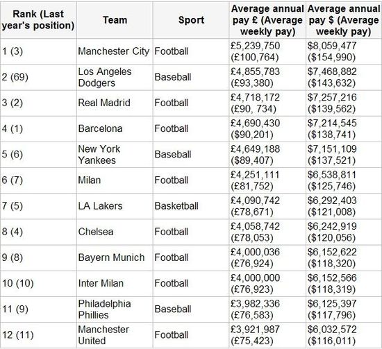 这份调查是由全球体育薪水调查公司(GSSS)和ESPN联合作出的,调查对象是世界知名体育俱乐部的一线队球员薪水,从下表我们可以看到,去年排在第三的曼城今年已经跃升第一位,曼城一线队平均周薪为10.0764万镑,折合为15.499万美元,比排在第二的洛杉矶道奇棒球俱乐部多7000镑;曼城年薪则为523.975万镑(805.9477万美元),同样排在全球体育俱乐部首位。