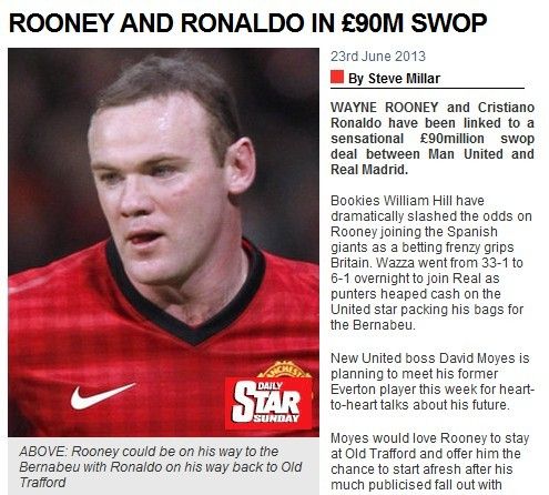 皇马目前的想法是,可以接受以6000万英镑的价格把C罗卖回曼联,但曼联也必须接受以3000万英镑的价格将鲁尼卖给皇马,换而言之也就是说,如果C罗与鲁尼互换门庭,这桩转会的总价值便高达9000万英镑。