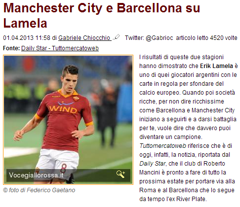 4月1日,英国的《每日星报》又发出消息称,曼奇尼的曼城俱乐部已经准备在今夏不惜一切代价将拉梅拉从罗马挖走。与此同时,巴塞罗那俱乐部也没有完全放弃对拉梅拉的争夺,诺坎普球场的主人已经关注了拉梅拉很长一段时间。