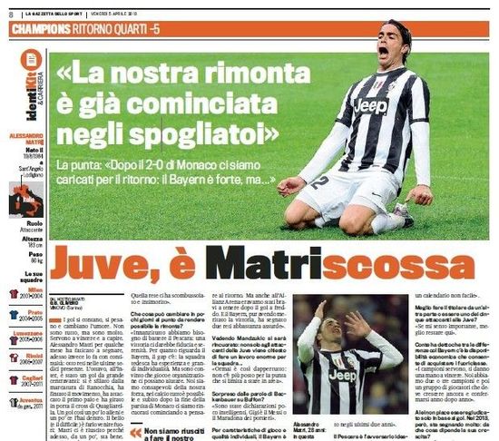 曼祖季奇在拜仁的进攻体系中用了大量的精力给队友服务,这和尤文图斯前锋的战术作用相似。对此,马特里表示,“现在,每支球队都一样,那种只愿待在禁区的中锋没有生存空间。”输给拜仁之后,布冯遭到贝肯鲍尔的嘲讽。对此,马特里赶紧维护队友,“贝肯鲍尔说了些蠢话。吉吉(布冯)就是门将中的梅西,或者马拉多纳。”针对两队次回合较量,马特里表示,“的确,大家可以说,拜仁实力胜过尤文图斯。在同拜仁的首回合比赛中,我们很少看到比赛节奏这么高的对手。当然,在同国际米兰的意大利国家德比中,我们也消耗了大量的精力。在次回合比赛中,尤文图斯不会有变化,我们要保持过去两年来一惯的踢法。”输球之后,孔蒂暗示尤文图斯转会缺少大手笔。“冠军球员的确重要,可以帮助球队获胜。我们有两三位冠军球员,其他球员要继续成长,以便证明自身实力。”