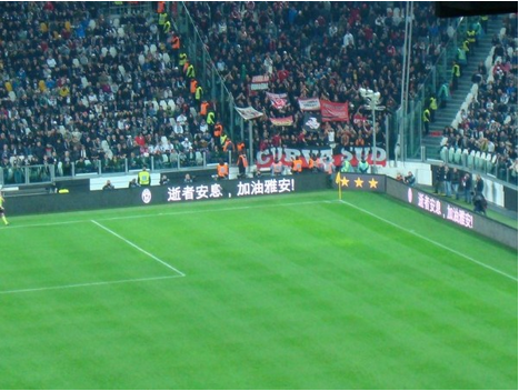 而在比赛的最后时刻,“逝者安息,雅安加油!”的标语又一次出现在了尤文的广告牌上,而这次并不像上半场那样只是昙花一现,而整整出现了长达2分钟的时间。而全场观众也集体鼓掌,不光是把这份掌声献给尤文的战士们,更是把这份掌声献给远在东方的朋友们。