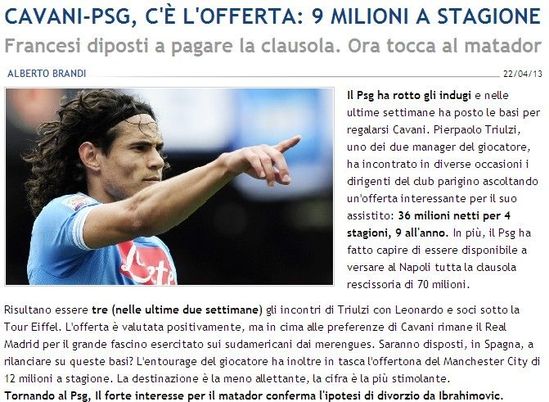 意甲进入最后收官阶段,而外国列强对于招牌球星的争夺战,已经进入高潮。《慢镜头》爆料,法甲金主巴黎圣日耳曼,已经向卡瓦尼发起猛烈攻势。卡瓦尼经纪人之一的图里兹,与巴黎技术总监莱昂纳多已经有过三次碰头,《慢镜头》甚至已经曝出,巴黎圣日耳曼给卡瓦尼开出的年薪是900万欧元。