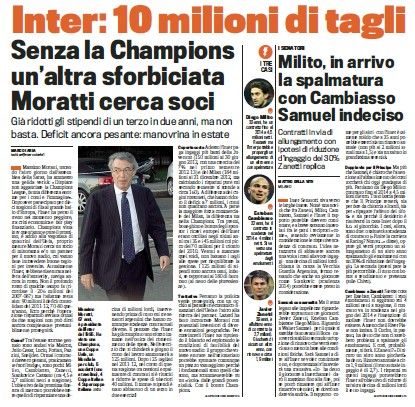 与同为北方三强中的尤文和米兰相比,国米的财政状况尤为糟糕。2007-08赛季,蓝黑军团的赤字总额高达2.06亿欧元,一度面临债务缠身的窘境。随后几年里,在俱乐部调整财政策略,以及球队09-10赛季勇夺三冠王带来的巨额回报(欧冠收入7000万欧元)的合力下,国米财政状况明显好转,上赛季亏损额减少到约9000万欧元。本赛季国米送走塞萨尔,麦孔,卢西奥,弗兰和斯内德等功勋球员,俱乐部赤字额进一步下降,有望维持在7000万-8000万欧元。
