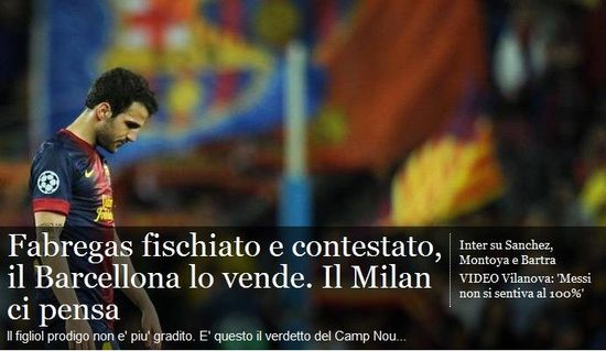 欧冠半决赛第二回合,做客的拜仁再次以3-0的比分羞辱巴萨。碌碌无为的法布雷加斯受到了诺坎普球迷的漫天嘘声。回归巴萨以来小法似乎很难融入球队体系,他始终生活在哈维和伊涅斯塔的阴影之下,而在中锋位置也难以发挥出自己的优势。法布雷加斯的斗志和状态也备受质疑,西班牙媒体认为前枪手队长将会在夏季被球队清洗。而米兰正是看准了这个机会准备向法布雷加斯出手。