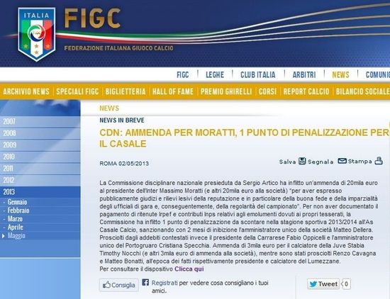 意大利足协在官网的一份声明中宣布了纪律委员会的决定,“意大利纪律委员会主席塞尔吉奥-阿尔蒂克决定给国际米兰主席马西莫-莫拉蒂开出两万欧元罚单,国际米兰也收到了两万欧元罚单。”至于其中的原因,意大利足协官网表示,“莫拉蒂公开发表言论,破坏了意大利足球的声誉,尤其是意大利裁判的声誉,也影响到了意大利足协组织运营赛事。”