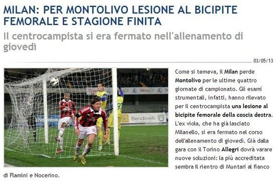 蒙托利沃的愿望可能要泡汤,针对康复时间,《Mediaset》进行了分析,“尽管随后的检查才会确定蒙托利沃精确的康复时间。事实上,这个问题没有太大疑问。本赛季意甲5月19日结束(AC米兰对阵锡耶纳)。如果没有奇迹,本赛季很难看到蒙托利沃重返赛场。”本赛季至今,意甲踢了34场,蒙托利沃出场31次,他是AC米兰的铁打主力。《Mediaset》认为,本周末AC米兰主场对阵都灵,阿莱格里可能采用蒙塔里来搭档弗拉米尼和诺切里诺。