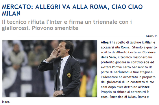 披露这一重磅消息的是《mediaset》,这家米兰喉舌媒体表示,阿莱格里是在与罗马高层互通电话后,正式做出的这一决定。阿帅现有合同2014年到期,但为了避免被俱乐部解雇的尴尬,他决定抢先下手“炒”掉老板。罗马为前卡利亚里主帅准备了一份为期3年的合同,这早已不是什么秘密,待遇细节尚不知晓,但阿帅已经接受了红狼的邀请,不出意外,今夏将在永恒之城开启新征程。