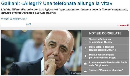 据《米兰体育报》报道,在上轮联赛前贝卢斯科尼特意打电话给阿莱格里,在电话中贝总曾要求继续安排沙拉维首发,但最终阿莱格里却把近来状态不佳的沙拉维放在了替补席上,这让贝总很恼火,这让阿莱格里留任的可能性进一步降低。虽然贝卢斯科尼的侵权漏税案在本周上诉失败,但官司缠身的他依然很关心米兰的成绩,而且贝总历来喜欢干涉球队的排兵布阵,过去就曾有米兰主帅不服从贝总的安排而最终下课。