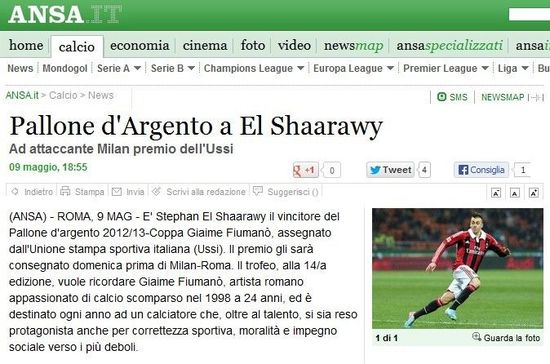 北京时间5月10日,《安莎社》报道,米兰球星沙拉维将获得2012/13赛季意甲银球奖,也就是意甲公平竞赛奖。在本周末米兰同罗马的比赛开始前,沙拉维将会接受USSI的颁奖。