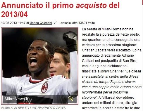 主场战平罗马,米兰并未提前锁定下赛季欧冠参赛资格。不过,俱乐部提前确定了一笔夏季收购:买断萨帕塔。《米兰新闻网》报道,加利亚尼提前宣布了2013/14赛季的第一签。