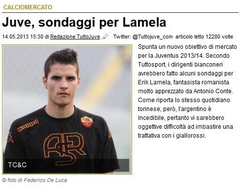 接连率队捧起两座意甲冠军奖杯之后,为了寻求欧战突破,孔蒂提出了引援要求。《米兰体育报》报道,孔蒂希望尤文图斯至少引进两名顶级前锋。近期,包括伊瓜因、桑切斯、迪亚曼蒂和约维蒂奇在内的优秀球员都和尤文图斯联系起来。《都灵体育报》报道,拉梅拉是尤文图斯在转会市场中的新猎物。2011年夏天,罗马1900万欧元收购拉梅拉。近两个赛季,拉梅拉进步很明显。本赛季,21岁的拉梅拉31场联赛打进15球,约维蒂奇才12球进账。这家意大利媒体报道,孔蒂很欣赏拉梅拉。目前,尤文图斯已经试探了罗马的态度。